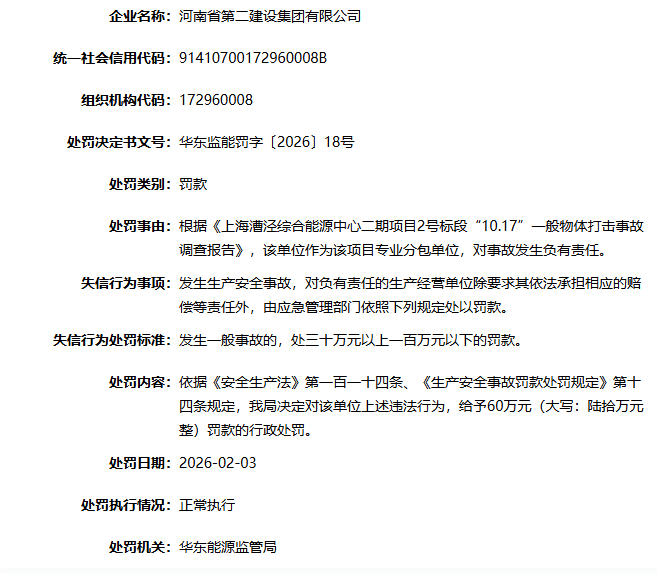 涉生产安全事故,河南省第二建设集团被罚60万